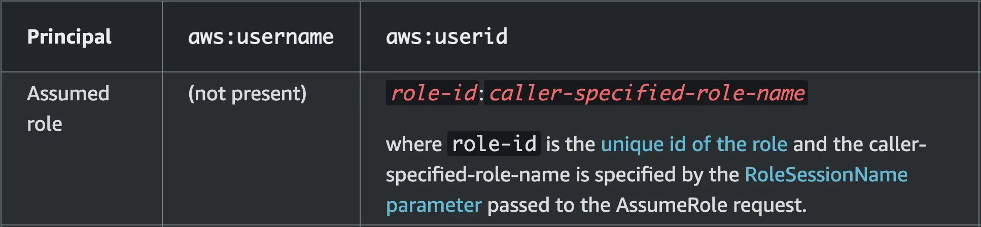 This means that when you assumed a role and make a request to AWS, the PrincipalArn in the request context will not be your assumed role ARN as in the output of get-caller-identity call, but just the ARN of the role, e.g. arn:aws:iam::111122223333:role/some-assumable-role, which isn’t as granular - it doesn’t specify the user who assumed it.